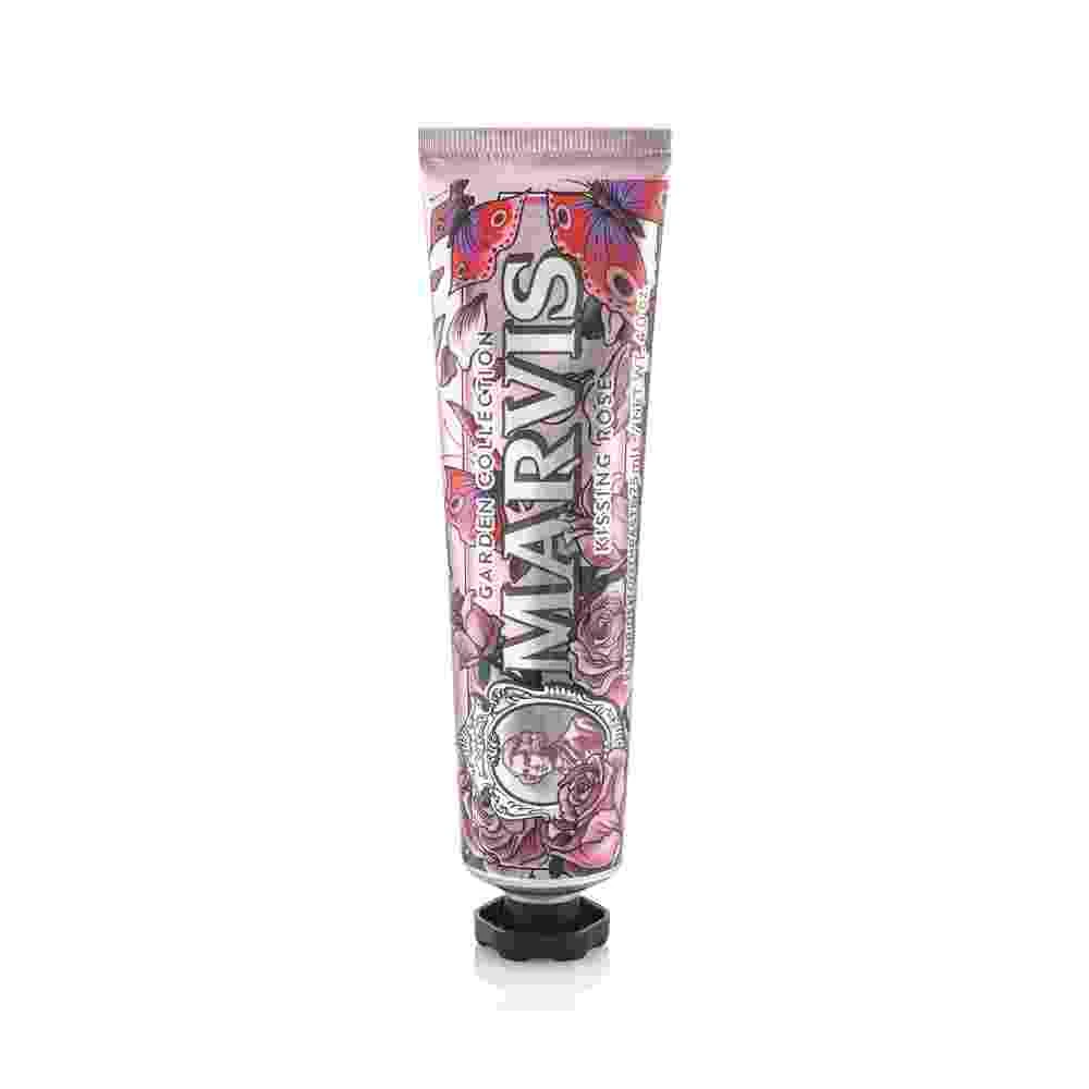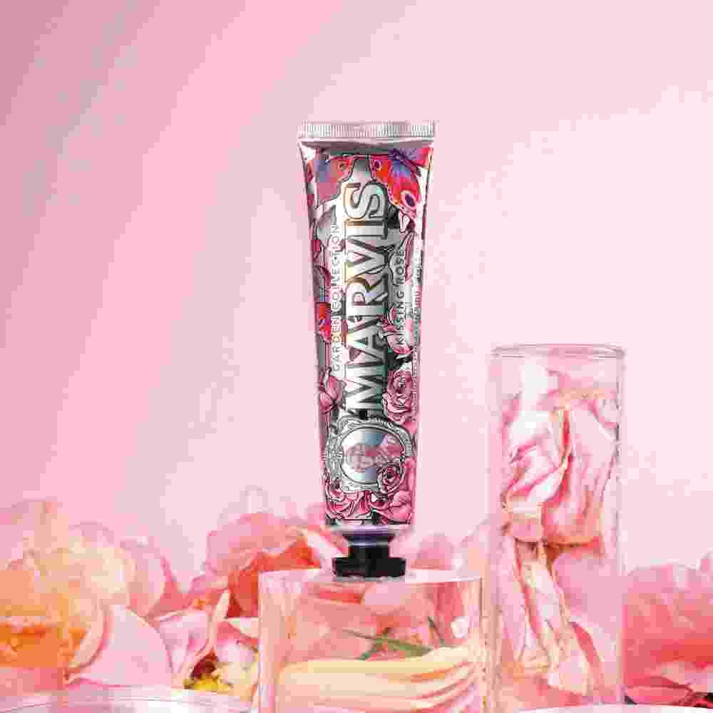 Le dentifrice Kissing Rose de la collection Garden de Marvis est une délicate explosion de fraîcheur florale : une saveur raffinée, romantique et délicate qui parfume le sourire avec des notes de rose bulgare et de menthe fraîche.